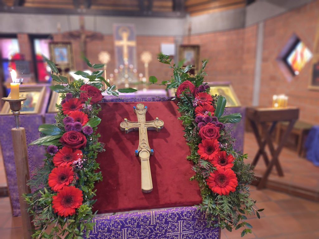 Nach der Prozession wurde das Heilige Kreuz in die Mitte der Kirche gestellt, damit die Gläubigen sich im Gebet vor dem Zeichen unseres Heils und des Sieges verneigen und es ehrfürchtig verehren konnten.